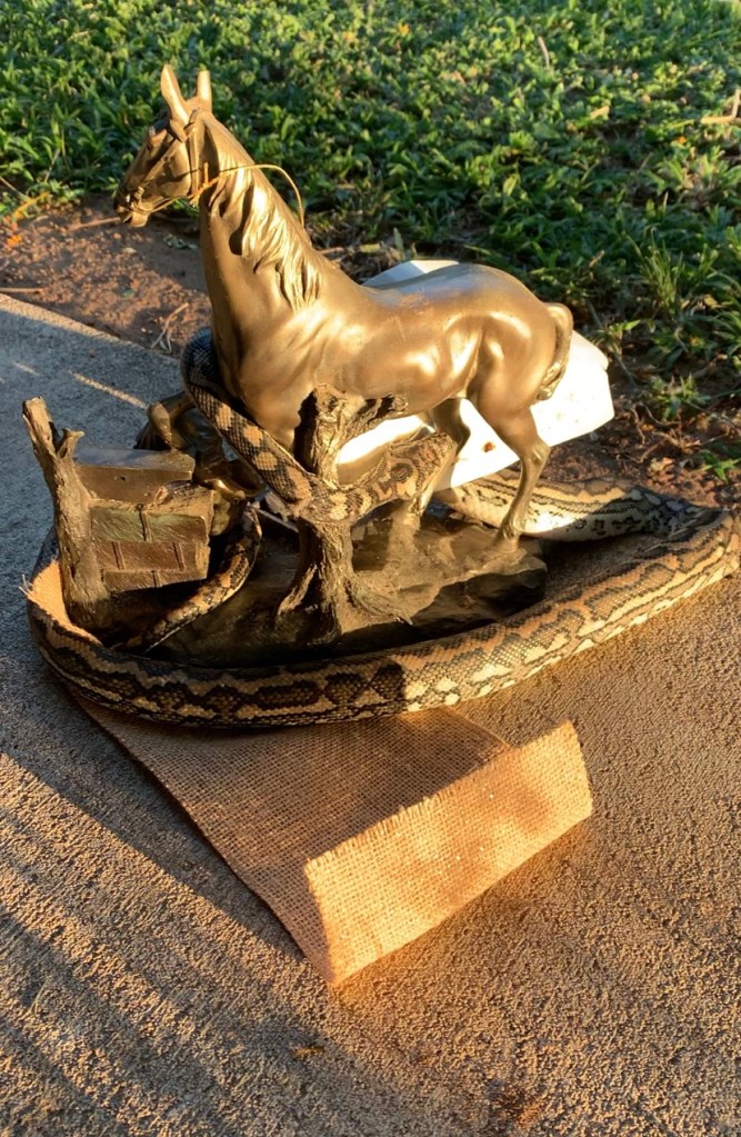 First was a python in the house! He had helped himself to a mouse I had caught on a sticky trap and in turn stuck himself to it and then wrapped himself around an ornament of mine beside the back door. Sorry Monty but you crossed the boundaries of friendship on that one.
